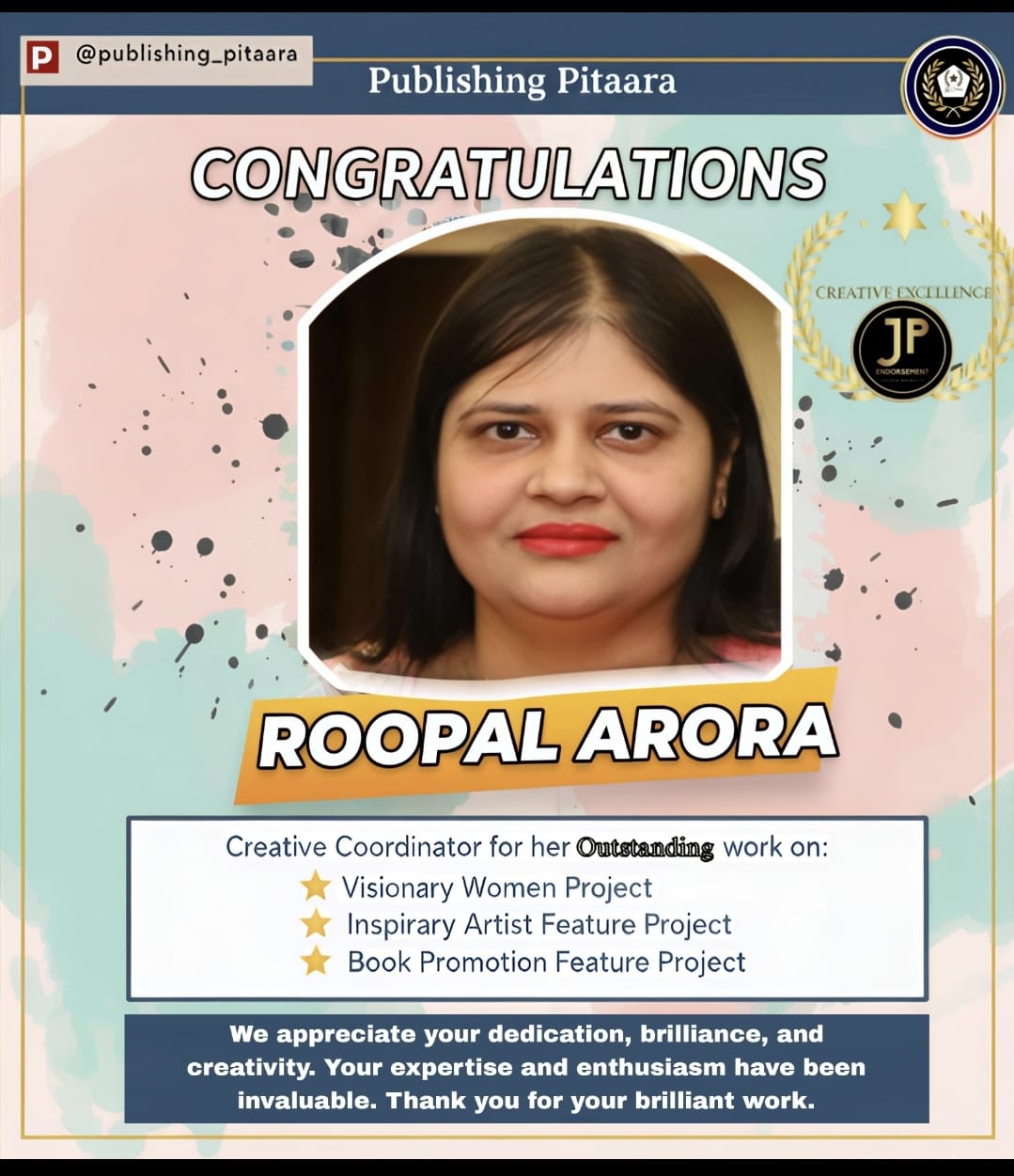 In the world of literature and digital creativity, Roopal Arora shines as a visionary Creative Coordinator at Publishing Pitaara. Combining technical mastery with literary passion, she has been instrumental in bringing groundbreaking projects to life.